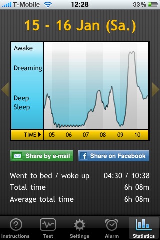 Das Schlafprotokoll kann man sogar per E-Mail oder Facebook mit anderen teilen – was interessant werden dürfte. Aufmerksam geworden bin ich auf die App, die derzeit mit 79 Cent im Vergleich zu Schlafphasenweckern aus dem Technikmarkt recht billig ist – über einen Beitrag auf Basic Thinking.