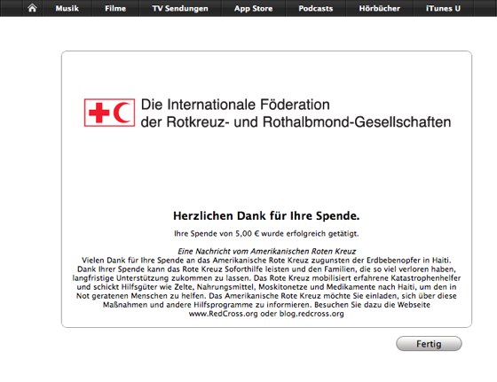Gerade eben bin ich zufällig über einen Artikel im fscklog gestolpert: Man kann den Erdbebenopfern in Haiti durch eine Geldspende an das Amerikanische Rote Kreuz helfen – via iTunes. Mit einem Mausklick wählt man den gewünschten Betrag aus und schickt die Spende ab. Genial einfach.