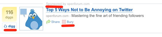 Mit diesen “DiggAds” fährt der Social-News-Aggregator nach eigenen Angaben seit vier Monaten sehr erfolgreich. Die Nutzer erhalten die Möglichkeit, eine Werbung zu “diggen” (lieben) oder zu begraben (bury). Die Werbung ist meist der dritte Beitrag auf der Startseite, der optisch als Textwerbung gekennzeichnet ist, ansonsten aber nicht weiter als Werbung auffällt (Markierungen von mir):