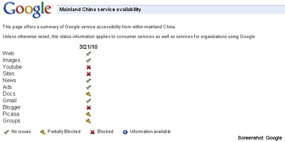 Da die chinesische Regierung während der Verhandlungen „crystal clear“ zum Thema Selbst-Zensur war, hatte Google seine Absicht, möglichst vielen Menschen auf der Welt einen freien Zugang zu unzensierten Suchergebnisseen zu geben, nur durch den Umweg über Hongkong gesehen. Laut eines Statements von David Drummond (Senior Vice President und Chief Legal Officer von Google) Google- Blog sei dieses Routing „entirely legal and will meaningfully increase access to information for people in China“. Um den chinesischen Google-Nutzern eine bessere Transparenz zu geben, ist eine Status-Website aufgesetzt worden, auf der man sehen kann, welche Google-Dienste auf dem chinesischen Festland frei nutzbar, teilweise oder gänzlich blockiert sind. Dieses Tool wird täglich aktualisiert.