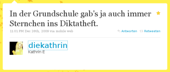 Außer dass ich mich selber sehr über Platzierungen dort freue (die mir aber nur sehr selten gelingen) benutze ich Favstar als “Best of Twitter”. Über die Menüpunkte “Popular“, “Rising” und “New” werde ich immer wieder auf mir noch unbekannte Twitterer aufmerksam. Wer übers Login seinen Twitter-Account mit Favstar verbindet, kann dann auch direkt aus der Seite heraus “faven” oder Retweets und Replys setzen. Und die Alltime-Liste empfehle ich Neu-Twitterern, die noch nicht wissen, wem sie folgen sollen, als Starterkit.