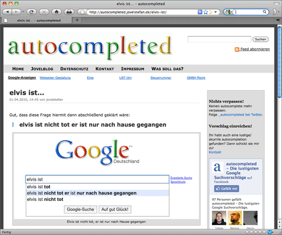 Stefan Heß, auch bekannt als JovelStefan, tut nichts anderes, als sich die Perlen der Autovervollständigung herauszupicken und zu bloggen. Wer das im Reader abonniert, hat regelmäßig was zu lachen. Eigentlich ist „Autocompleted“ nur ein Nebenblog und Stefans Hauptblog natürlich auch lesenswert. Ich wünsche viel Spaß!