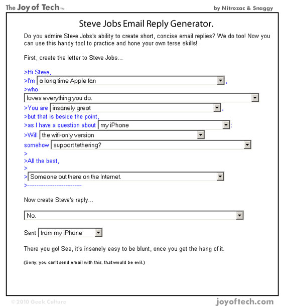 Alle paar Tage taucht eine angebliche Mail von Steve Jobs in den News auf, in welchen er kurz und prägnant seine Position zu einigen Fragen bezüglich Apple-relevanter Themen von sich gibt. Zumeist sind sie einsilbig (Nope) oder aber sehr kurz gehalten (It’s not that big of a deal). Kürzlich beantwortete er die Frage, ob es einen App-Store für Macs geben soll, klar mit ‘Nope’. Bezüglich des sensiblen Themas Flash käme nur eine vorgefertigte Antwort in Frage “[expletive], [expletive].” Angesichts der immer wieder kehrenden Antworten haben Nirtozac und Snaggy auf der Website The Joy Of Tech einen automatischen Email-Beantwortungsgenerator entwickelt, mit denen man die üblichen Fragen an “His Steveness” auch gleich selbst beantworten kann.