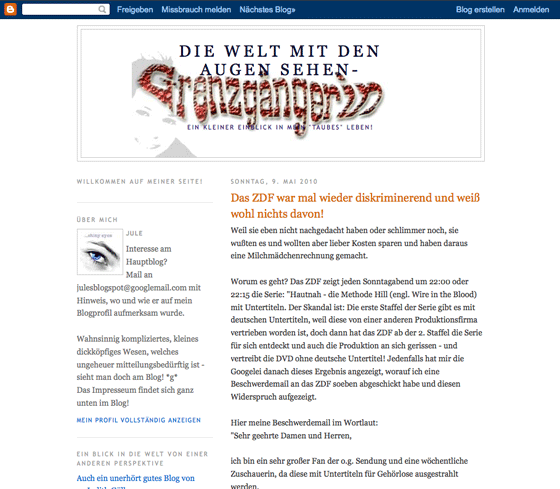 Jule – medizinisch gesehen taub aber technisch gesehen mit einem Cochlear-Implantat mal recht mal schlecht hörend – berichtet aus ihrem Alltag. Und das ist ganz oft auch der ditigale Alltag. Sie schreibt über die Vergeblichkeit, ohne Gebärdensprachedolmetscher an der re:publica teilzunehmen, oder ob das iPad eigentlich für Gehörlose geeignet ist. Sie wundert sich über DVDs des ZDF, die ohne Untertitel veröffentlicht wurden, obwohl die Sendung im TV noch Untertitel hatte, und erklärt, wie sie ihren Arzt zum (deutlicheren) Reden bringt. Mal ärgerlich, mal lustig, aber immer lesenswert.