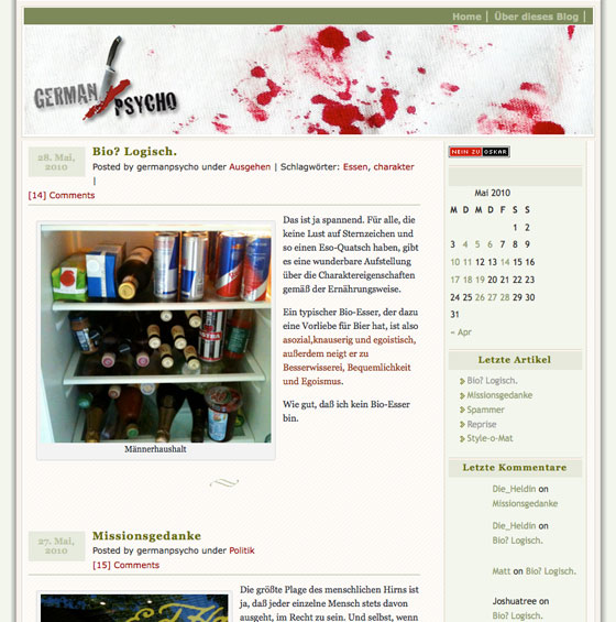Wenn schon das Wetter immer noch mies und so gar nicht sommerlich ist, sollen wenigstens die Blogs unterhaltsam sein. Daher verweise ich in unserer Sonntagsreihe “Best of Blogs” dieses mal auf German Psycho. Der anonyme Blogger ist ein großer Fan von “American Psycho” und bloggt als dessen deutsches Alter Ego.