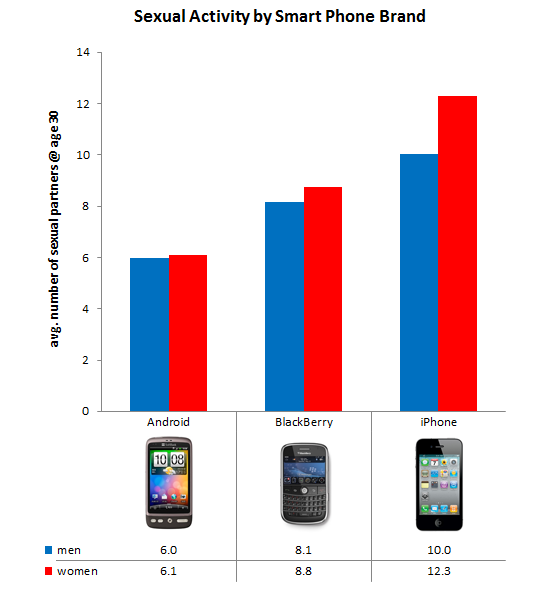 Schaut man sich die Grafik an, stimmt die Aussage allerdings nicht: Es geht weniger darum, wieviel Sex eine statistische Person hat, sondern wie viele Sexualpartner sie im Alter von 30 Jahren hatte. Männer dieses Alters, die ein iPhone besitzen, haben demnach in ihrem Leben mit 10 verschiedenen Frauen geschlafen, während die Besitzer eines Android-Telefons nur 6 Frauen ins Bett kriegen konnten. Bei dreißigjährigen Frauen sieht das ganz ähnlich aus: Während Android-Nutzerinnen statistisch 6,1 Männer nicht von der Bettkante geschubst haben, waren es bei iPhone-Besitzerinnen doppelt so viele.
