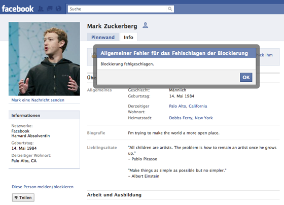 Natürlich habe ich das auch gleich ausprobiert und bin auf Zuckerbergs Facebook-Profil gegangen, um selbiges zu blocken. Es geht nicht und wird mit einer Fehlermeldung quittiert. Bemerkt haben das die Betreiber einer Protestseite, die unter der schönen Domain blockzuck.com eine Anleitung veröffentlicht hatten, wie man Mark Zuckerberg auf Facebook blocken kann. Entweder haben sie ihre eigene Anleitung nicht ausprobiert, oder aber – was ich für wahrscheinlicher halte – Zuckerberg hat sich seine Sonderrechte erst vor kurzem dazu programmieren lassen. Wäre Facebook ein Onlinespiel, der Chef wäre ein Cheater. Aber vermutlich spielt er sowieso im God-Mode.