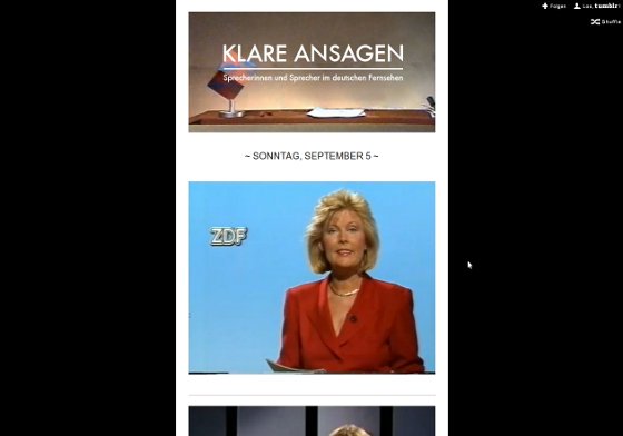 Wer erinnert sich noch an die Zeiten, als Fernsehansager – oder meistens Ansagerinnen – uns erzählten, was es gleich zu sehen gibt? Das Blog “Klare Ansagen” hat Fernsehstandbilder aus dem vergangenen Jahrhundert gesammelt und ich war wirklich baff, wieviele Gesichter ich plötzlich wiedererkannte – aber auch, wie “normal” Ansager(innen) aussehen durften.