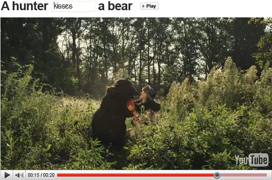 Zunächst sieht es aus wie eine ganz normale Youtube-Seite, wobei allerdings schon irritiert, dass bestimmte Bedienelemente wie das Einbetten fehlen. Das Video zeigt einen Jäger, der offenbar zu tierlieb ist, um den Grizzly zu erschießen, der über seine Essenvorräte hergefallen ist. Kurzerhand greift er zum Korrekturabroller, der in der Werbung neben dem Video gezeigt wird, und weißt das “shoots” im Titel des Videos aus.