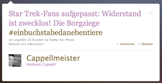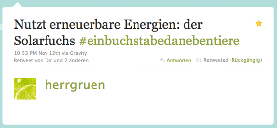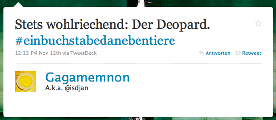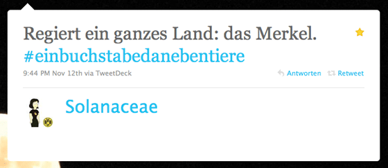Das Mem startete am Freitag, aber der Strom reißt bis zur Stunde nicht ab. Tausende von #einbuchstabedanebentiere-Tweets rauschen bis zur Stunde durchs Netz. Wer mal nachschauen will, kann das über die Twittersuche tun, aber bei tweetwall.de gibt es auch schon eine eigene Twitterwall dafür.