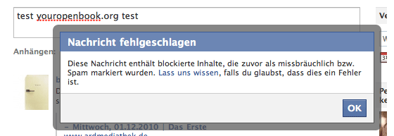 Als es neulich stundenweise nicht möglich war, die Facebook-Parodie “Lamebook” auf Facebook zu erwähnen, wiegelten die Zuckerberger ab: Das ganze sei nur ein Versehen gewesen. Dabei ist es nach wie vor nicht möglich, auf Facebook eine Nachricht abzusetzen, die die Zeichenkette “youropenbook.org” enthält.