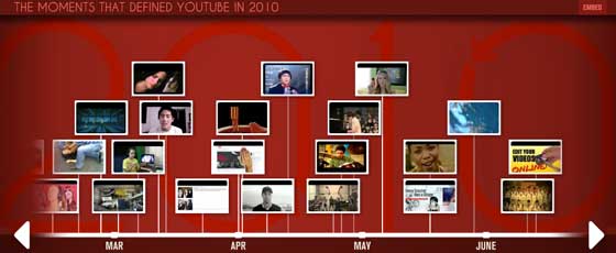 Den hat Youtube jetzt zusammengestellt und als “Youtube Rewind – 2010 – The year in review” veröffentlicht. Der Jahresrückblick kommt als übersichtliche Zeitleiste, die über zwei Pfeile gescrollt werden kann. Daran angeknüpft sieht man Vorschaubilder für die einzelnen Filme, die per Mausklick vergrößert und betrachtet werden können.