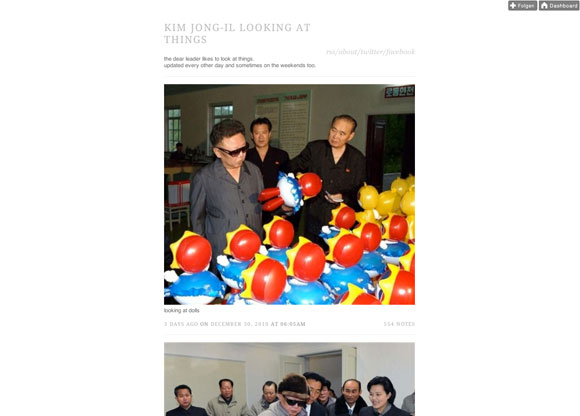 Diktatoren gucken sich ja gerne Dinge an. Andere Leute, Experten und hohe Tiere stehen mit stolzgeschwellter Brust daneben. Bei Nord-Koreas Kim Jong Il ist das nicht anders. Und weil das jedes mal ein Event ist, wenn der geliebte Führer wieder Dinge anguckt, berichtet ein Blog darüber. Es heißt: Kim Jong Il looking at things.