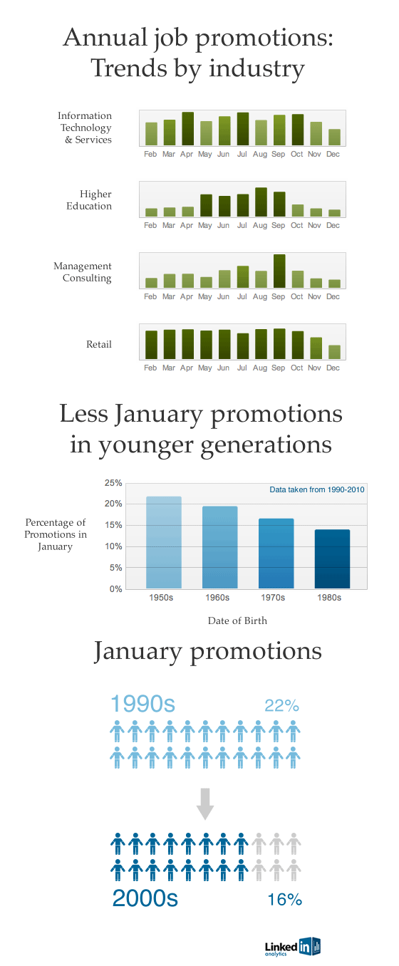 LinkedIn weiß, wie man die Öffentlichkeit auf sich aufmerksam macht. Eher nicht mit Testimonials, die sowieso niemand glaubt, sondern mit Fakten. Wenn man ein soziales Netzwerk betreibt, sitzt man auf einem Haufen Daten, welchen sich trefflich analyisieren und an die Öffentlichkeit geben lassen. So geschehen in Form einer Pressemitteilung, die eine interessante Frage beantwortet: In welchem Monat werden eigentlich die meisten Menschen befördert?