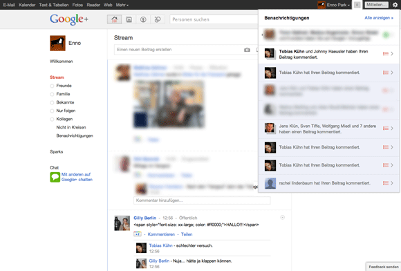 Weiter Pluspunkte sind eine eingebaute Chatfunktion namens Hangout und vor allem die Circles. Während Facebook seine Anwender mit Gruppen und Listen heillos überfordert, so dass man dort üblicherweise einfach alles an alle postet, bietet Google eine einfache Möglichkeit, seine Kontakte in verschiedene “Kreise” einzuteilen wie zum Beispiel Freunde, Bekannte usw. Das ist zwar immer noch etwas umständlich, aber sehr viel besser gelöst als auf anderen Plattformen und löst auf brauchbare Art das Problem, dass Partybilder vom Wochenende eben wirklich nur für den Freundeskreis sind.