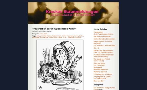 Krankheitsbedingt lag YuccaTree eine Weile brach. Immerhin hatte ich viel Gelegenheit zu lesen und neue Blogs zu entdecken. Kraskas Staunmeldungen ist eines dieser Blogs, die in keine Schublade passen: Ist es Literatur? Satire? Politik? Alltagsbeobachtung? Ego-Bloggen? Was fiktiv, was real? Irgendwie alles zugleich, aber vor allem eines: Amüsant. Statt das Blog hier näher zu beschreiben, erlaube ich mir ein Zitat: